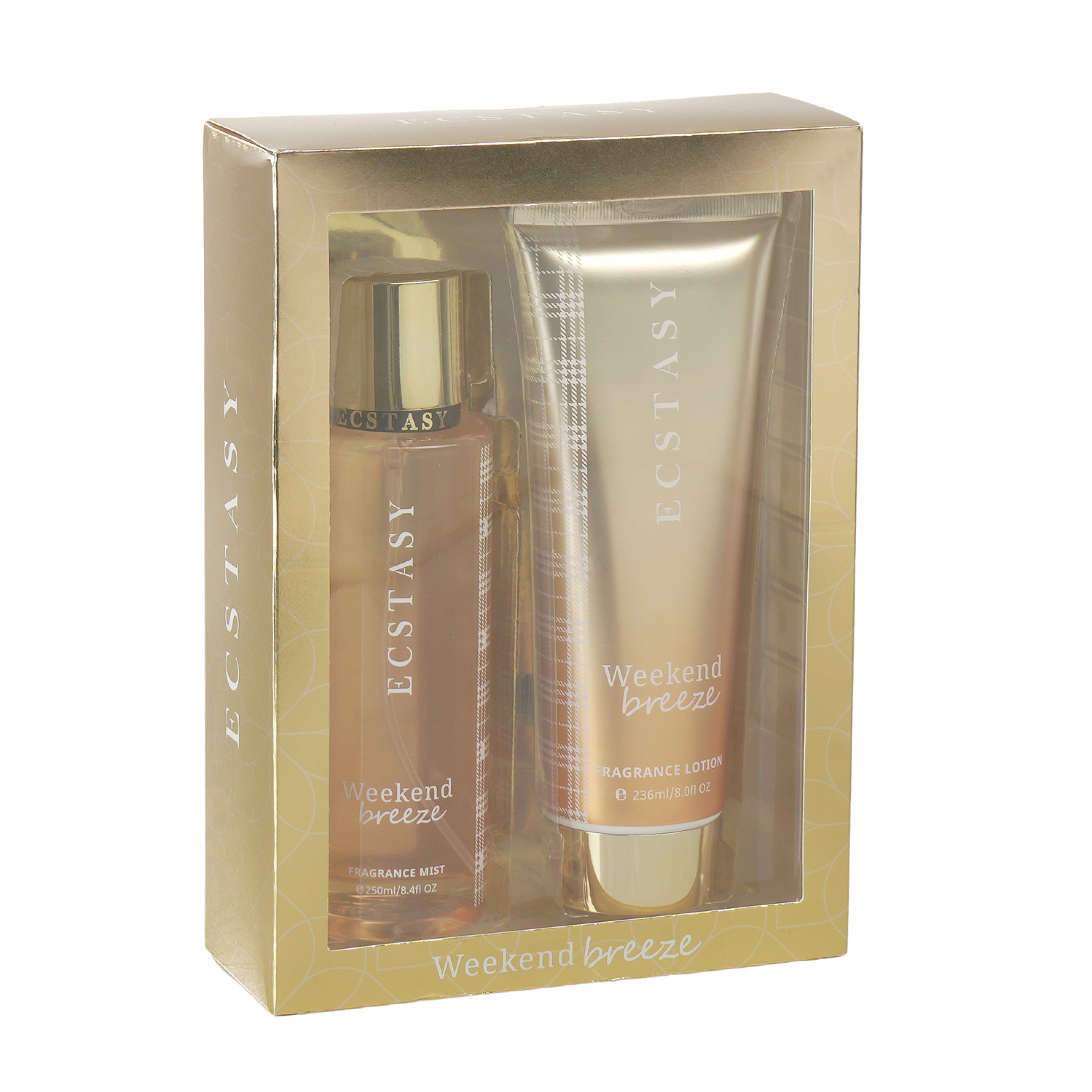Το Ecstasy Weekend Breeze Gift Set αποπνέει φρεσκάδα και ανεμελιά. Μανταρίνι, ροδάκινο και απαλά λουλούδια συνδυάζονται με musk για ένα ανάλαφρο, χαρούμενο άρωμα. Το body mist 250ml και η κρέμα σώματος 236ml προσφέρουν αίσθηση καθαριότητας και φρεσκάδας που διαρκεί.
